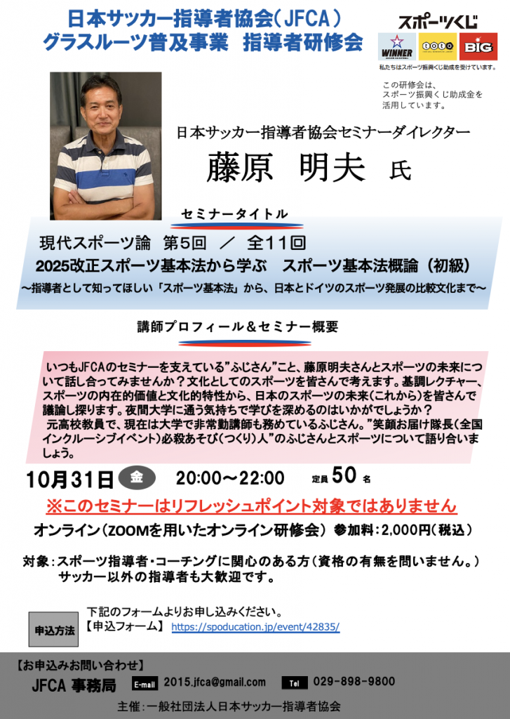 2025年度 日本サッカー指導者協会(JFCA) オンラインセミナー 現代スポーツ論 第5回 2025改正スポーツ基本法から学ぶ スポーツ基本法概論(初級)~指導者として知ってほしい「スポーツ基本法」から、日本とドイツのスポーツ発展の比較文化まで~(講師:藤原明夫氏)開催のご案内
